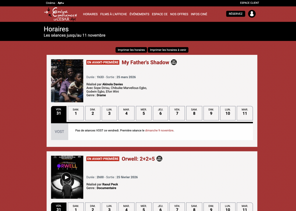 Commandez directement en ligne sur le site du Cinéma le César, onglet Horaires pour sélectionner les films