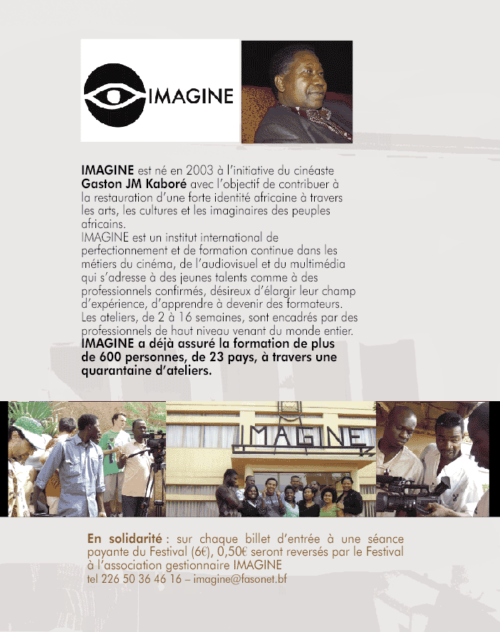 Cette année, sur chaque billet dentrée, 0,50 € sont reversés par le Festival à lassociation IMAGINE à Ouagadougou